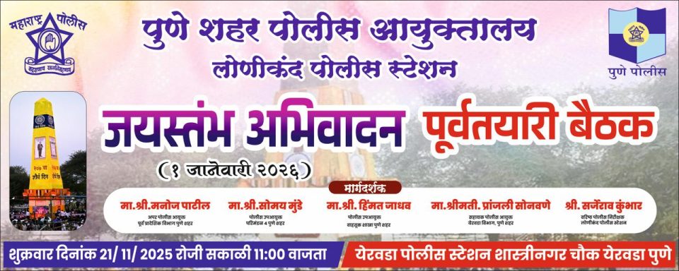 पुणे ता.१९: लोणीकंद पोलीस स्टेशन पुणे शहर हद्दीतील पुणे अहिल्यानगर रोडवरील पेरणे फाटा ता.हवेली जि. पुणे येथील विजयस्तंभ येथे लाखो अनुयायी यांचे वतीने एक जानेवारी २०२६ रोजी विजयस्तंभास अभिवादनासाठी देशभरातून सुमारे दहा ते पंधरा लाख अनुयायी येण्याची शक्यता आहे. पोलीस प्रशासनाच्या वतीने करण्यात येणाऱ्या उपाययोजना संदर्भात माहिती देण्यासाठी तसेच सर्व संघटनांचे प्रमुख व कार्यकर्ते तसेच अनुयायी यांचेकडून सूचना जाणून घेण्यासाठी मनोज पाटील, अप्पर पोलीस आयुक्त, पूर्व प्रादेशिक विभाग पुणे शहर, सोमय मुंडे, पोलीस उपायुक्त परिमंडळ 4, हिम्मत जाधव, पोलीस उप आयुक्त वाहतूक शाखा, श्रीमती प्रांजली सोनवणे सहाय्यक पोलीस आयुक्त येरवडा विभाग यांचे मार्गदर्शनाखाली जयस्तंभ अभिवादन २०२६ चे पूर्वतयारी संदर्भात पोलीस प्रशासनाचे वतीने बैठकीचे आयोजन करण्यात आले आहे.