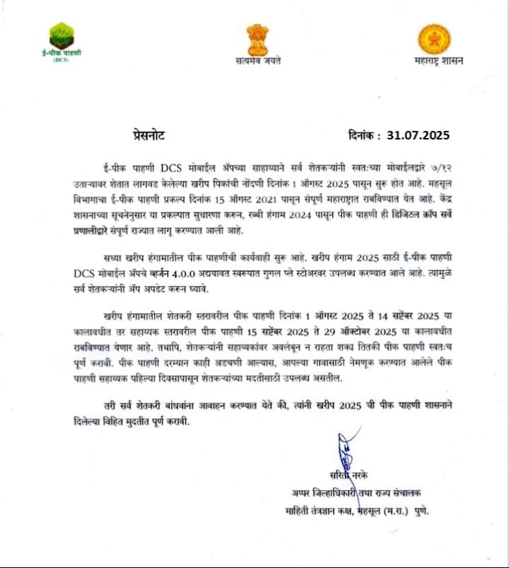 वरील हंगामातील शेतकरी स्तरावरील पीक पाहणी १५ सप्टेंबर २०२५ ते २९ ऑक्टोबर २०२५ या कालावधीत राबविण्यात येणार आहे. तथापि शेतकऱ्यांनी सहाय्यकावर अवलंबून न राहता शक्य तितकी पीक पाहणी स्वतःच पूर्ण करावी. पीक पाहणी दरम्यान काही अडचणी आल्यास आपल्या गावासाठी नेमणूक करण्यात आलेले पीक पाहणी सहाय्यक पहिल्या दिवसापासून शेतकऱ्यांच्या मदतीसाठी उपलब्ध असतील. अप्पर जिल्हाधिकारी सरिता नरके यांनी सर्व शेतकरी बांधवांना आवाहन केले की त्यांनी खरीप २०२५ ची पीक पाहणी शासनाने दिलेल्या विहित मुदतीत पूर्ण करावी.